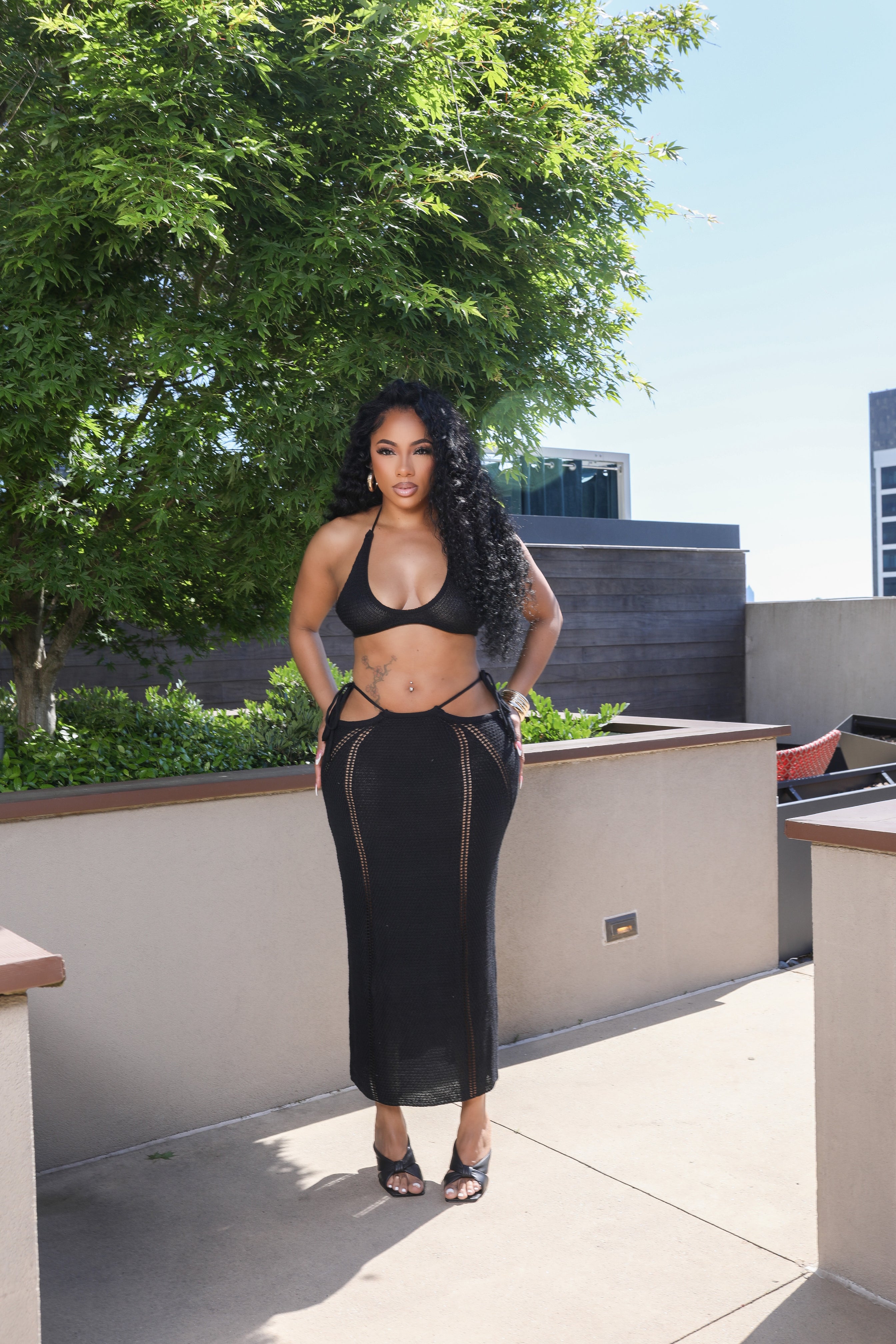 Look bold & beautiful in this blacked out net set . Model is wearing a large .